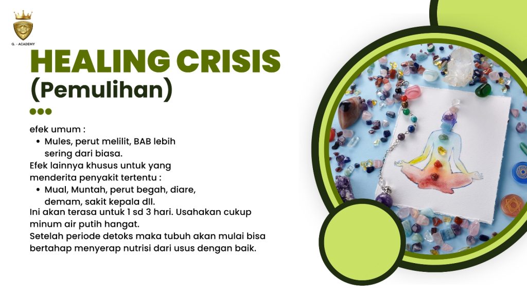 Selama konsumsi G Slimfit sebagian orang mengalami Healing crisis atau Reaksi Detoksifikasi. lalui saja proses ini dengan :