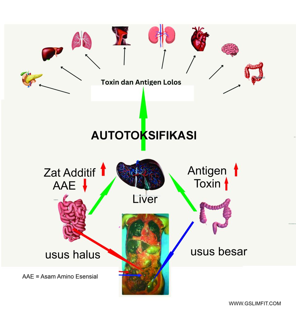 • Usus yang tidak bersih penuh dengan sisa makanan yang membusuk dan menghasilkan toksin berbahaya seperti lipopolisakarida (LPS).